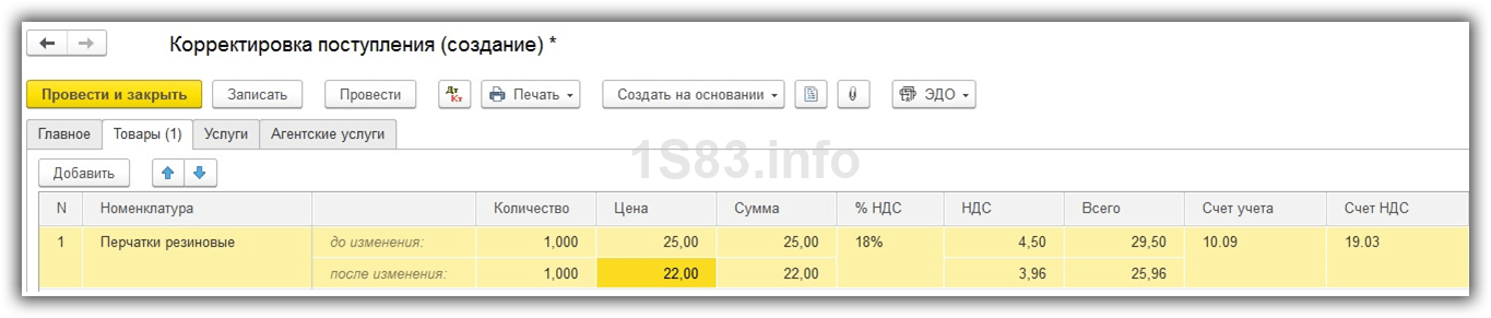 Перейдя на вкладку «Товары» мы видим, что в соответствующей табличной части уже добавлены наши резиновые перчатки со всеми остальными данными. При этом сама строка разделена на две подстроки. В верхней части указаны данные из первичного документа поступления, а в нижней – корректировка.