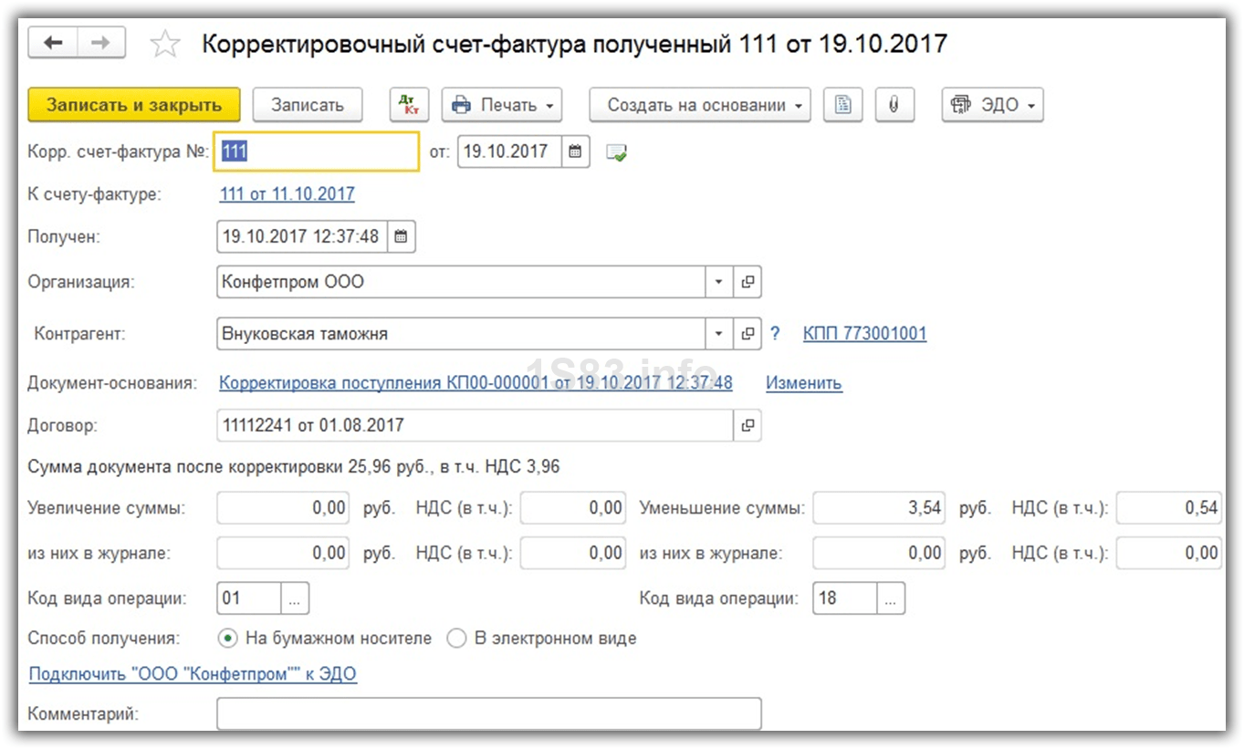 Корректировка поступления и счета-фактуры от поставщика на уменьшение