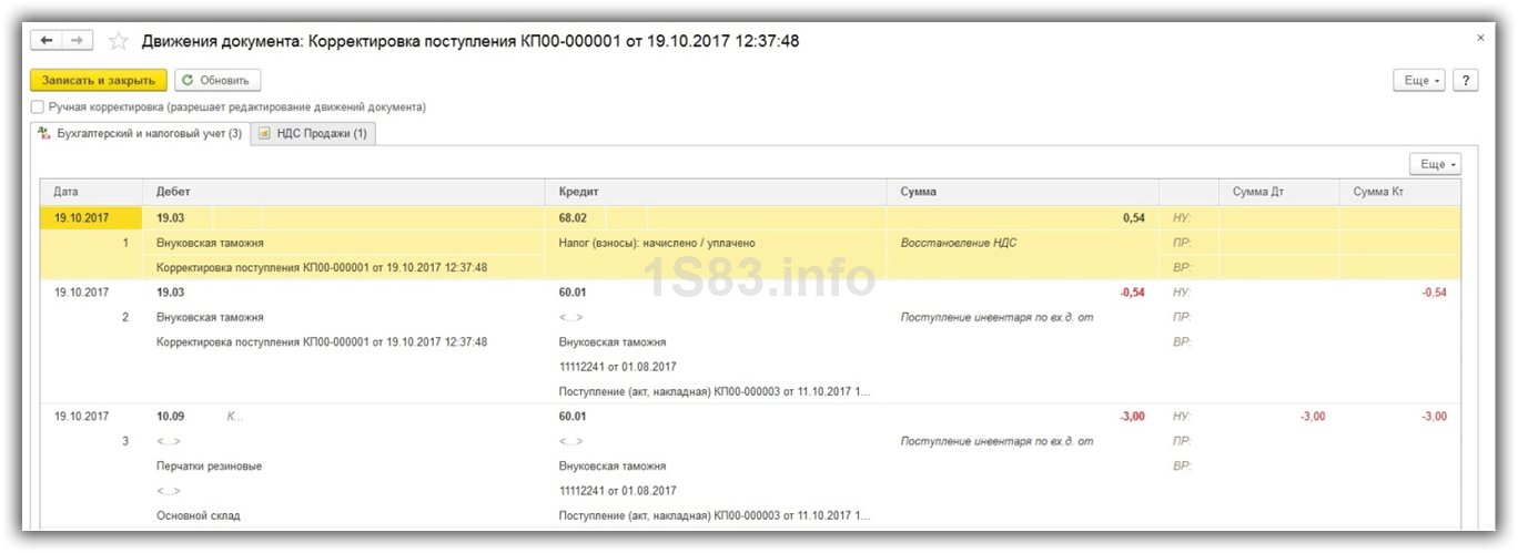 Проведем корректировку и проверим сформированные движения. Как видно на рисунке ниже, произошла корректировка стоимости резиновых перчаток на 3 рубля. Так же была произведена корректировка НДС на сумму в 18% от этой стоимости. Она составила 54 копейки.