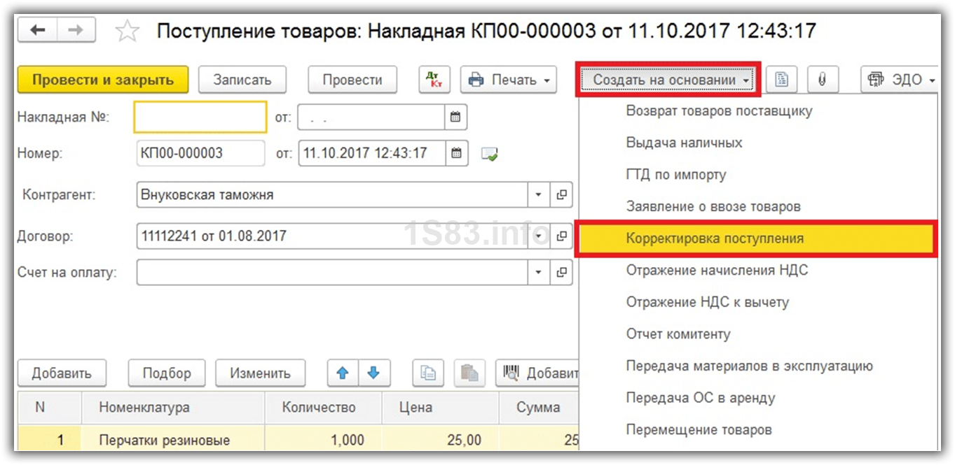 Для того, чтобы исправить ранее созданный документ поступления существует его корректировка. Ввести корректировочный документ можно непосредственно из самого поступления, как показано на рисунке ниже.