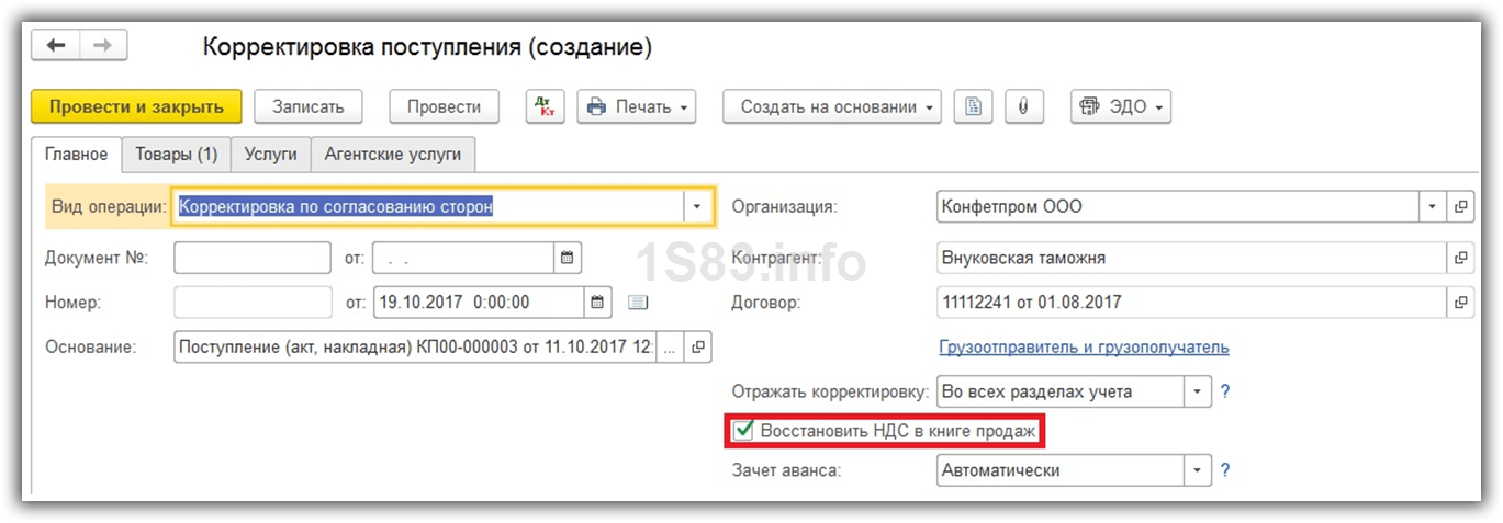 Обратите внимание, что на первой вкладке «Главное» в нашем примере установлен флажок «Восстанавливать НДС в книге продаж». Дело в том, что цена и как следствие стоимость перчаток была снижена