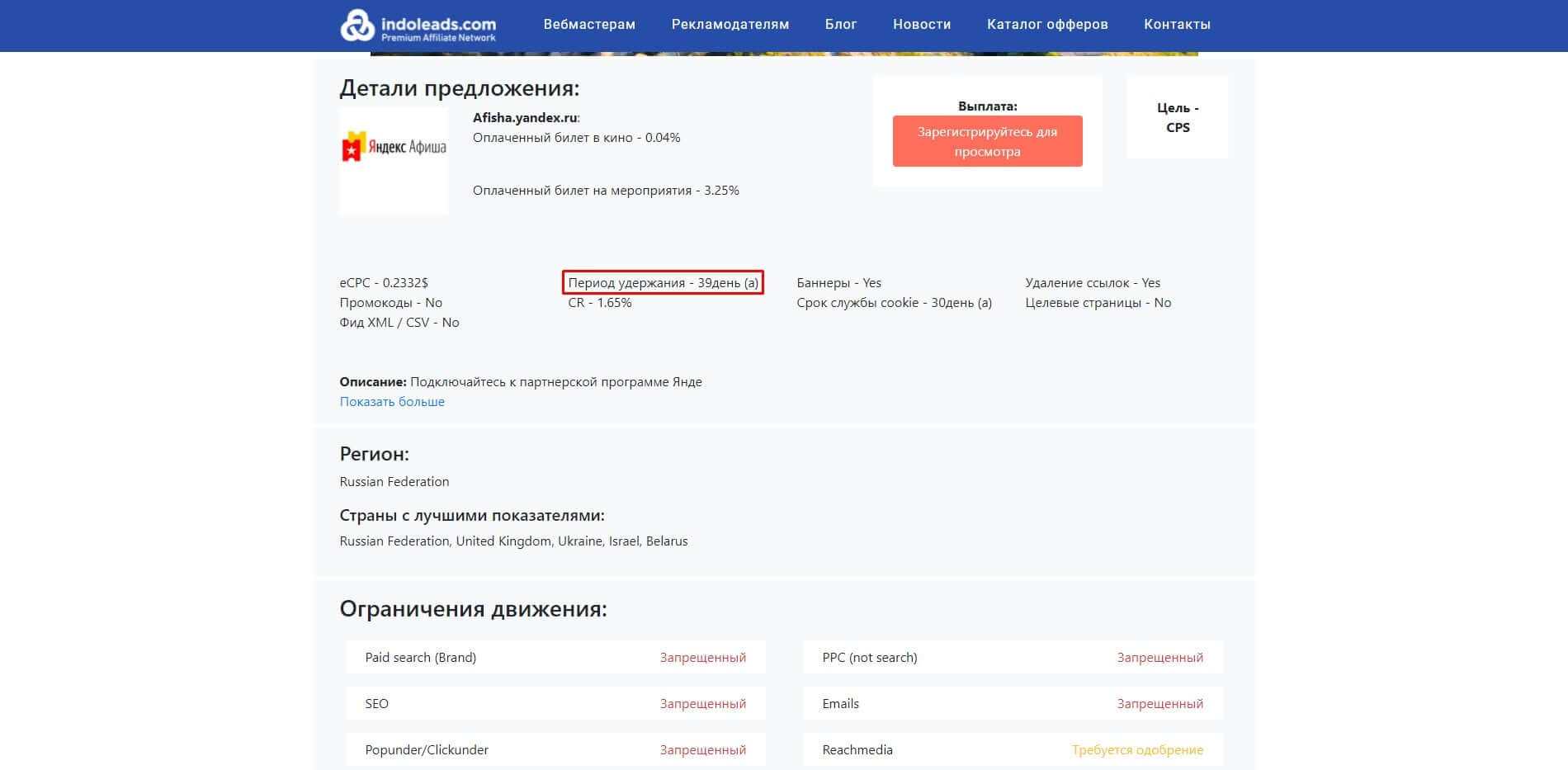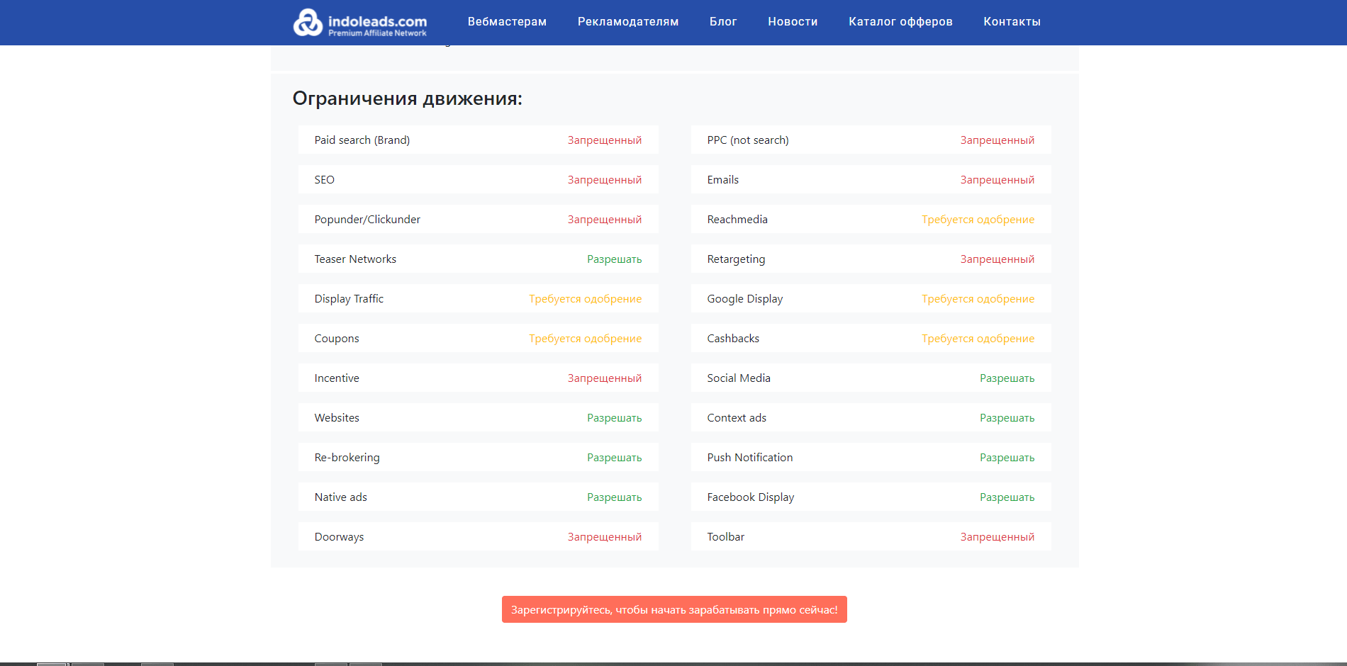 Рекламодатель может установить ограничения по источникам трафика. Изучите их — в Indoleads ограничения указаны в удобной таблице прямо в оффере. Например, на такой оффер может лить трафик с 8 каналов:
