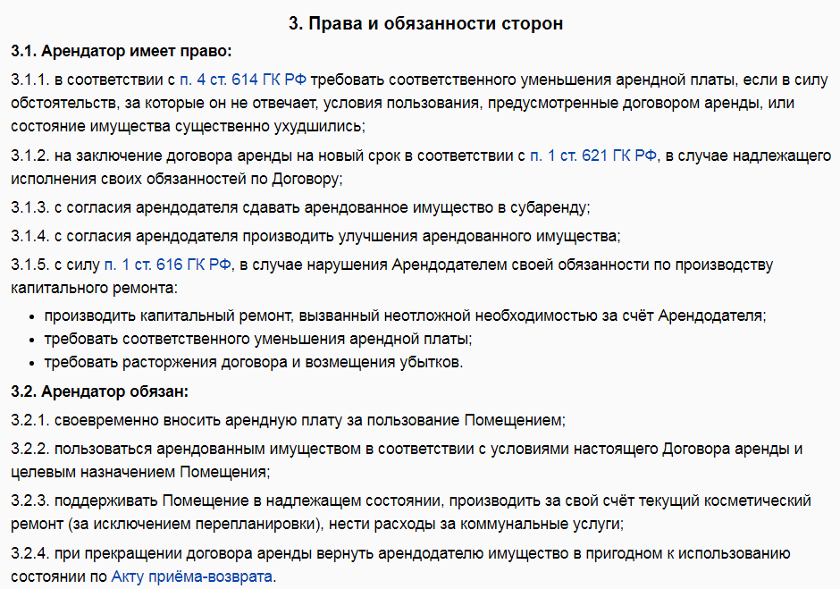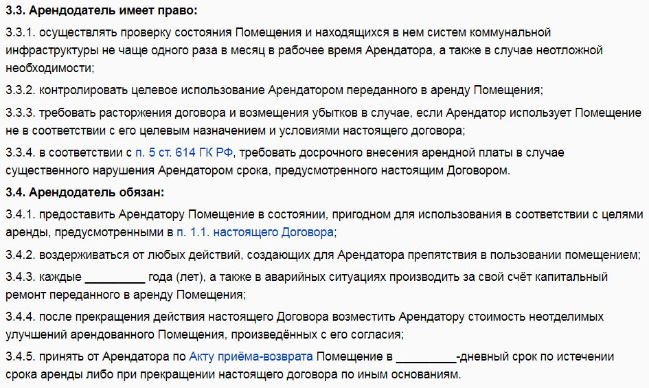 Это наиболее важный пункт с точки зрения разделения ответственности арендатора и арендодателя. В кратком виде права и обязанности описаны в таблице.