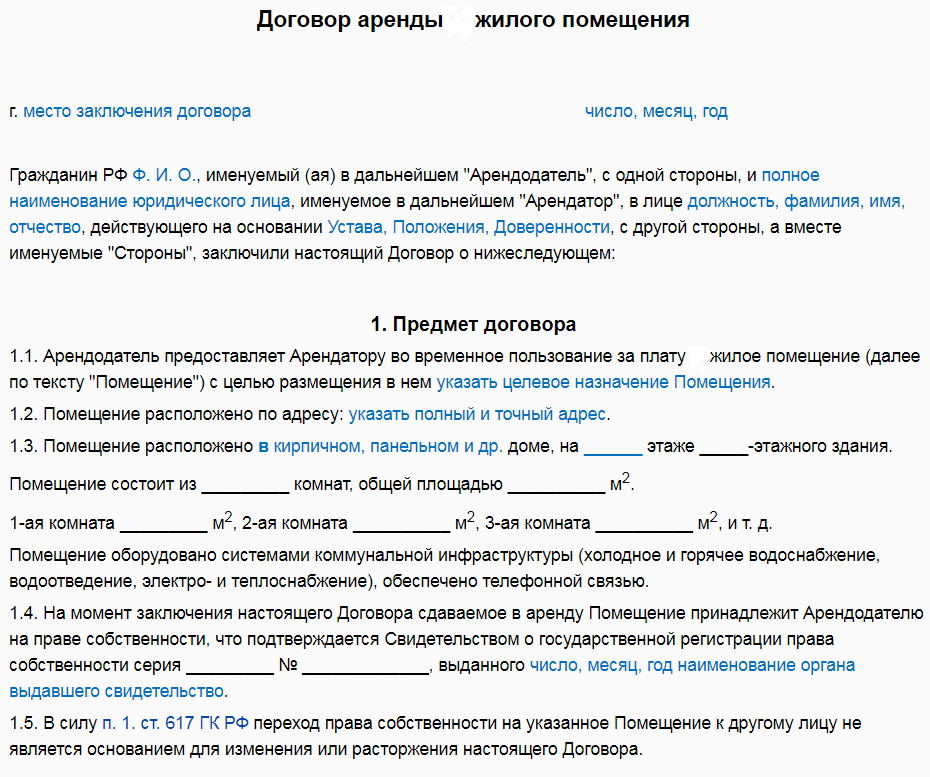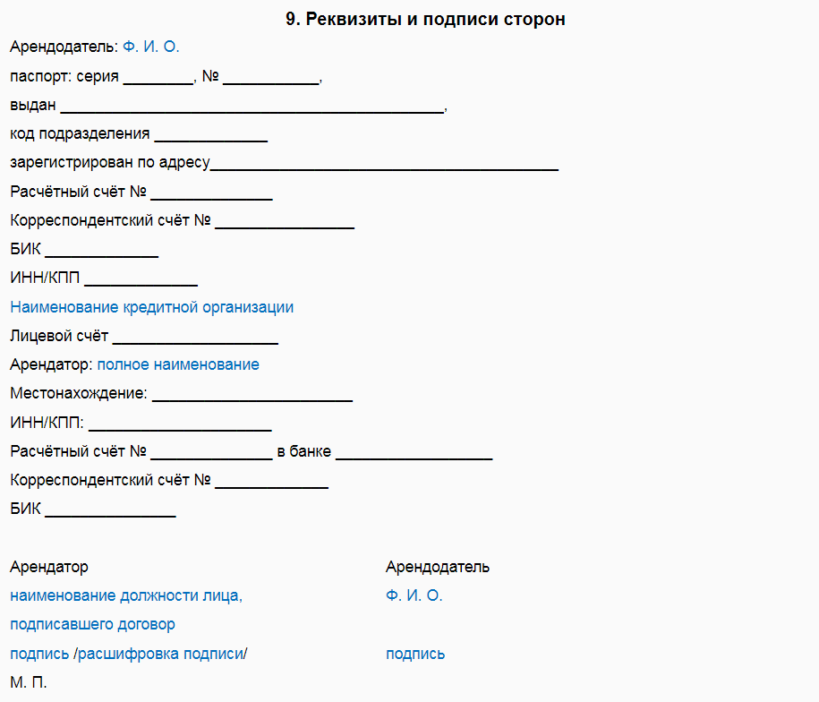 Более подробное содержание контракта между юридическим лицом и физическим отражено в образце договора аренды с физлицом, который можно скачать в разделе «Документы и бланки» в начале статьи. Он же может послужить и как образец договора аренды имущества между физическими лицами, т. к. составляется по аналогичным правилам, только вместо реквизитов юридического лица в его текст включаются данные физического.
