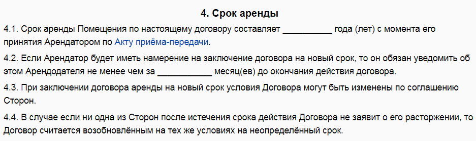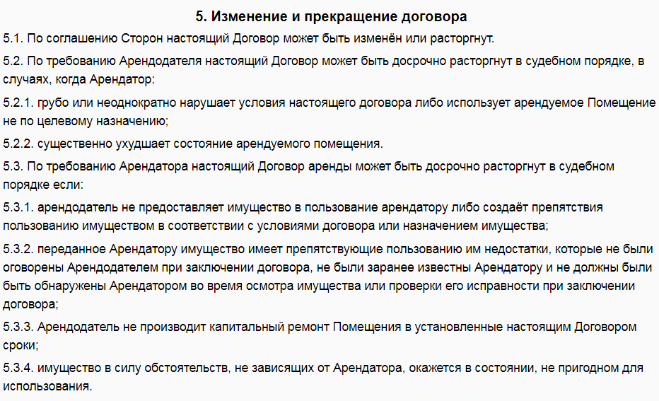 Срок определяется как конкретная дата или же не определяется совсем. Пункт об изменении и возможном расторжении договора следует прописать особенно подробно – стороны должны указать порядок расторжения, а также список возможных причин.