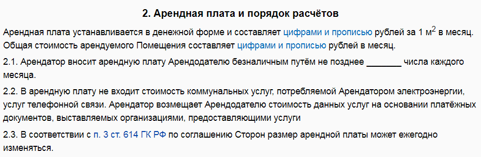 Поскольку помещение предоставляется в пользование частной компании, принято указывать не только общий размер ежемесячного платежа, но и плату за 1 квадратный метр. Отдельно прописываются такие пункты: