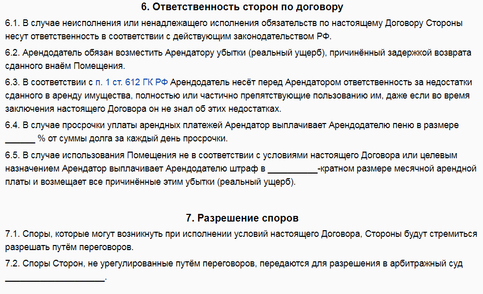 Арендатору и арендодателю также следует прописать ответственность за использование самой квартиры и имущества, находящегося в ней: кто компенсирует возможные убытки, как они будут оцениваться. Ответственность предусматривается и за просрочку ежемесячного платежа – заранее устанавливается процент от суммы, который будет начисляться ежедневно. Прочие разделы составляются аналогично тому, как это делается в других гражданских договорах.