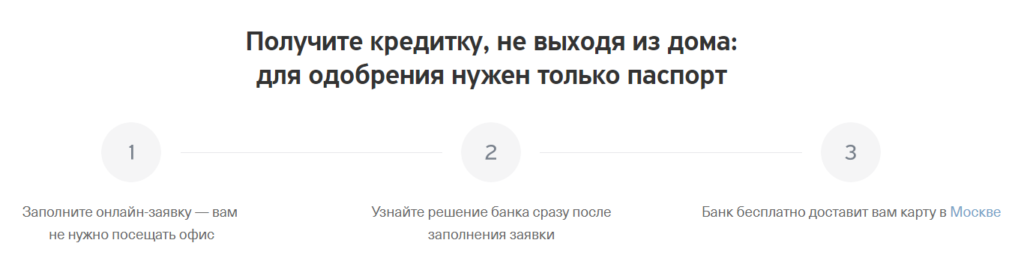 Клиенту потребуется выбрать кредитку из предложенных на сайте, и, нажав желтую кнопку «Оформить карту», перейти к заполнению заявки. Ответив на вопросы анкеты, и предоставив паспортные и контактные данные, оформляемую заявку отправляют на рассмотрение, и уже через несколько минут приходит смс с решением банка.