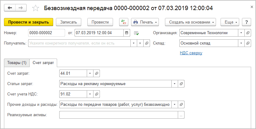 На закладке Счет затрат в поле Счет затрат следует самостоятельно установить требуемый счет (например, счет 44.01 «Издержки обращения в организациях, осуществляющих торговую деятельность» с видом расхода Расходы на рекламу (нормируемые)).