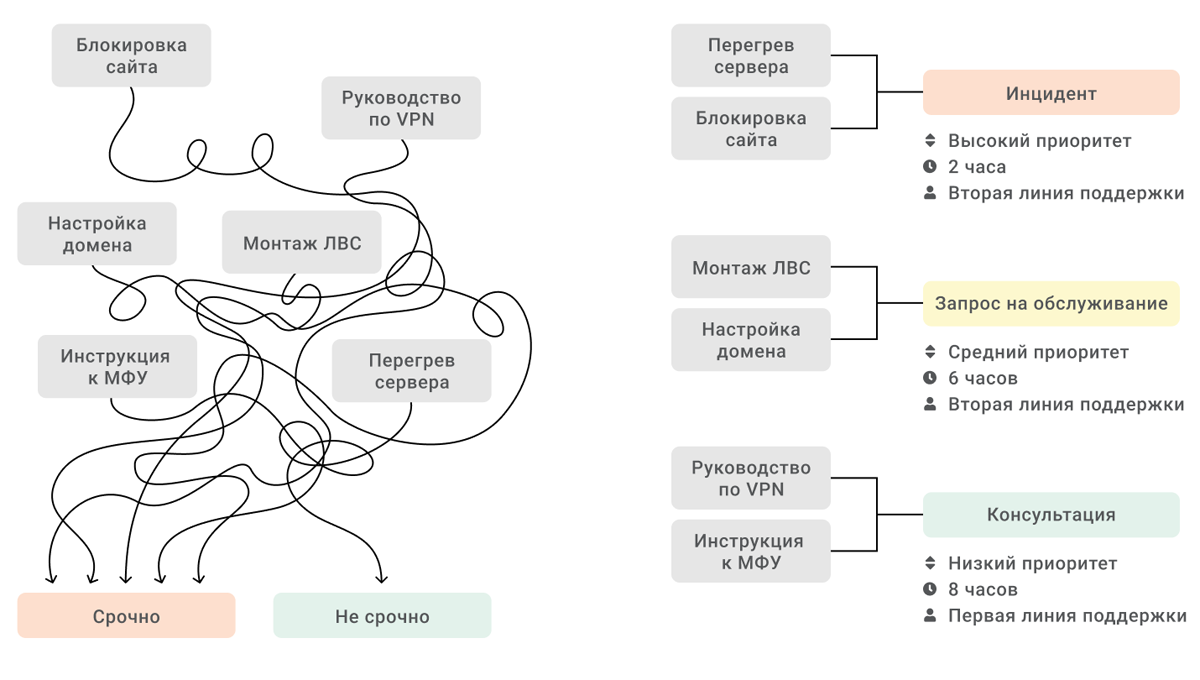 Появилась новая проблема: отсутствие единого подхода к рабочим процессам. Обращения пользователей обрабатывались в хаотичном порядке, не было понимания о том, кто несёт ответственность за решение конкретной проблемы. От этого страдало качество поддержки и росло время ожидания пользователей.