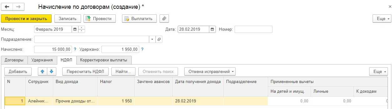 Важно учесть, что если Вы выберете “расчеты с контрагентами”, то начисления будут видны в счете 76.10 “Прочие расчеты с физическими лицами”. При этом будет осуществлена синхронизация с конфигурацией 1С: Бухгалтерия предприятия; Однако если вы проставите “расчеты по оплате труда”, то данные операции будут видны по кредиту счета 70 “Расчеты с персоналом по оплате труда” и способ отражения в бухучете будет задаваться непосредственно в самом документе