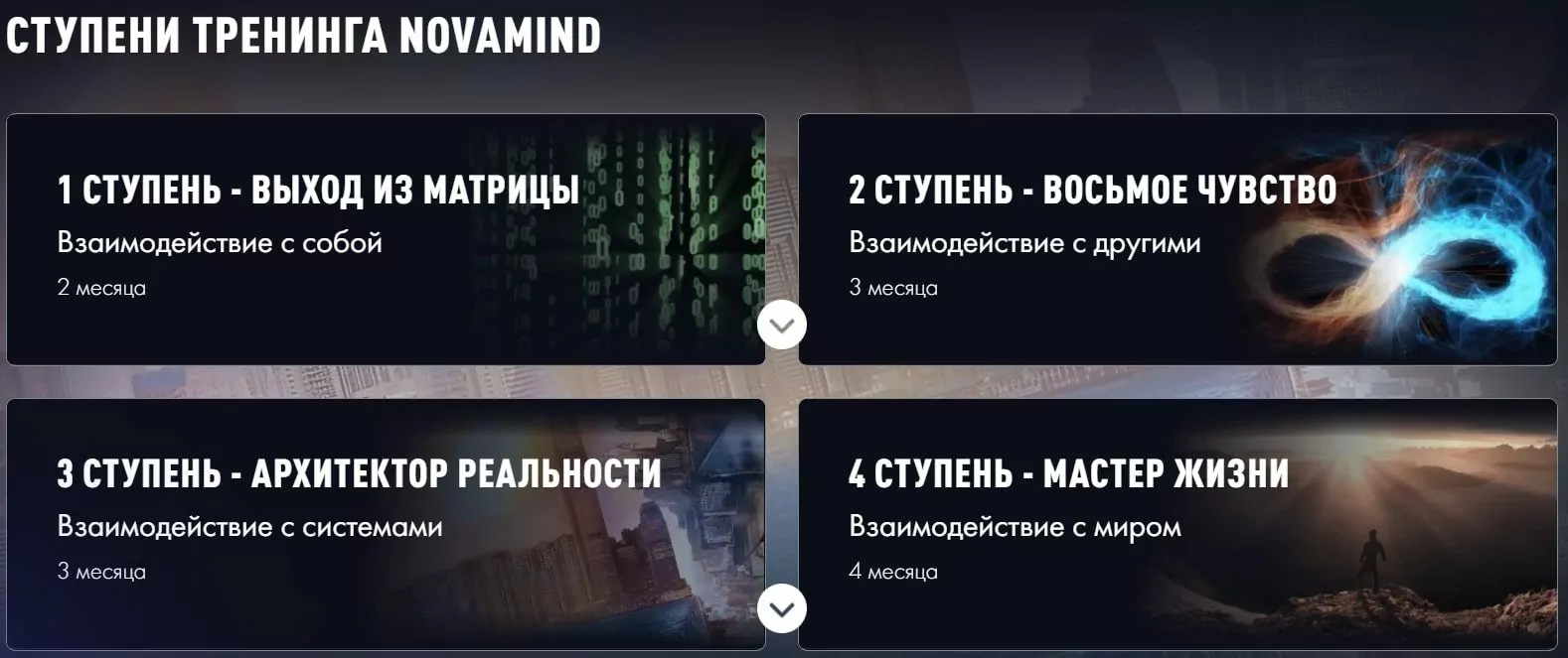 Курс Novamind состоит из четырех ступеней, доступ к каждой из которых приобретается отдельно. Все ступени работают с психологическими установками, которые мешают общению с окружающими и продвижению по карьере, менторству и подаче себя: