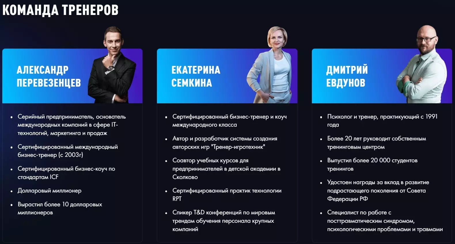 Тренеры компании NovaVi — бизнес тренеры, психологи со стажем обучения людей, успешные бизнесмены и самые счастливые люди, которые не один год обучались, применяя его на практике в реальном времени. Эти специалисты несомненно знают в этом деле все риски.