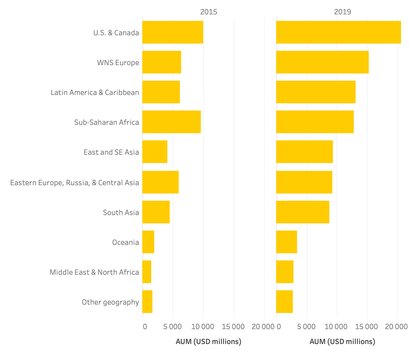 Рост импакт-инвестирования в разных регионах в 2015 vs 2019
