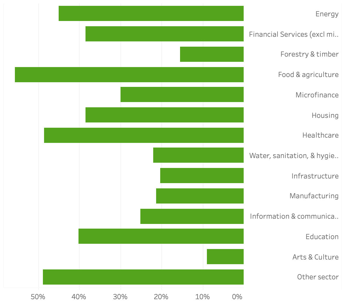 В настоящее время импакт-инвестирование по-прежнему представляет собой лишь небольшой рынок по сравнению с глобальным рынком акций, оцененный Всемирным банком в 2015 году в 61 триллион долларов США (рыночная капитализация отечественных листинговых компаний). Импакт-инвесторы управляли активами импакт-инвестирования на сумму 114 миллиардов долларов, что, по данным GIIN за 2017 год, служит наилучшей доступной «площадкой» для размера рынка импакт-инвестирования. Ежегодный опрос инвесторов Impact. Крупнейшими секторами по распределению активов были микрофинансирование, энергетика, жилищное строительство и финансовые услуги.