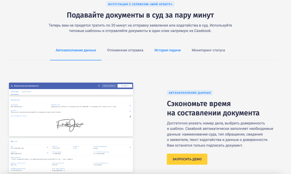 В Casebook выстроена интеграция с порталом «Мой арбитр», поэтому отправить документы можно прямо из сервиса за пару минут. Укажите номер дела, выберите типовой шаблон, доверенность, и система дозаполнит данные. Останется только подписать. Чтобы не пропустить срок, воспользуйтесь функцией отложенной отправки. Также вы получите доступ к записям онлайн-заседаний и аудиопротоколам.
