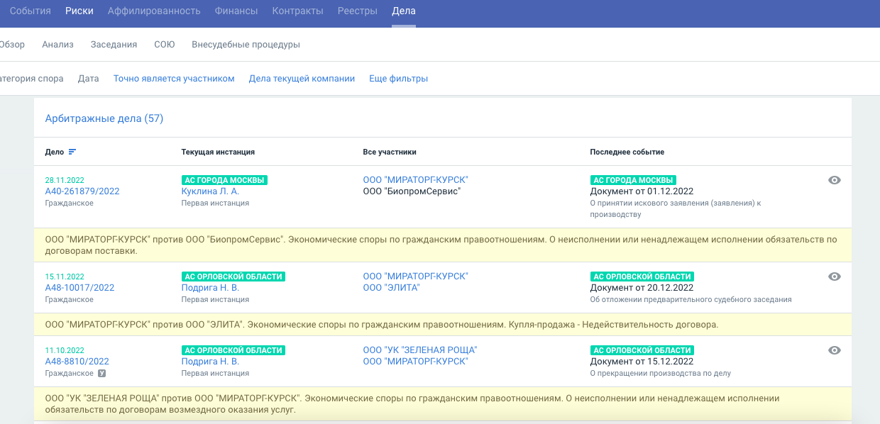 Недостаток государственных ресурсов — скудный объем информации и ее бессистемность. Чтобы получить подробные и комплексные сведения, рекомендуем использовать сервис проверки контрагентов и мониторинга судебных дел Casebook.