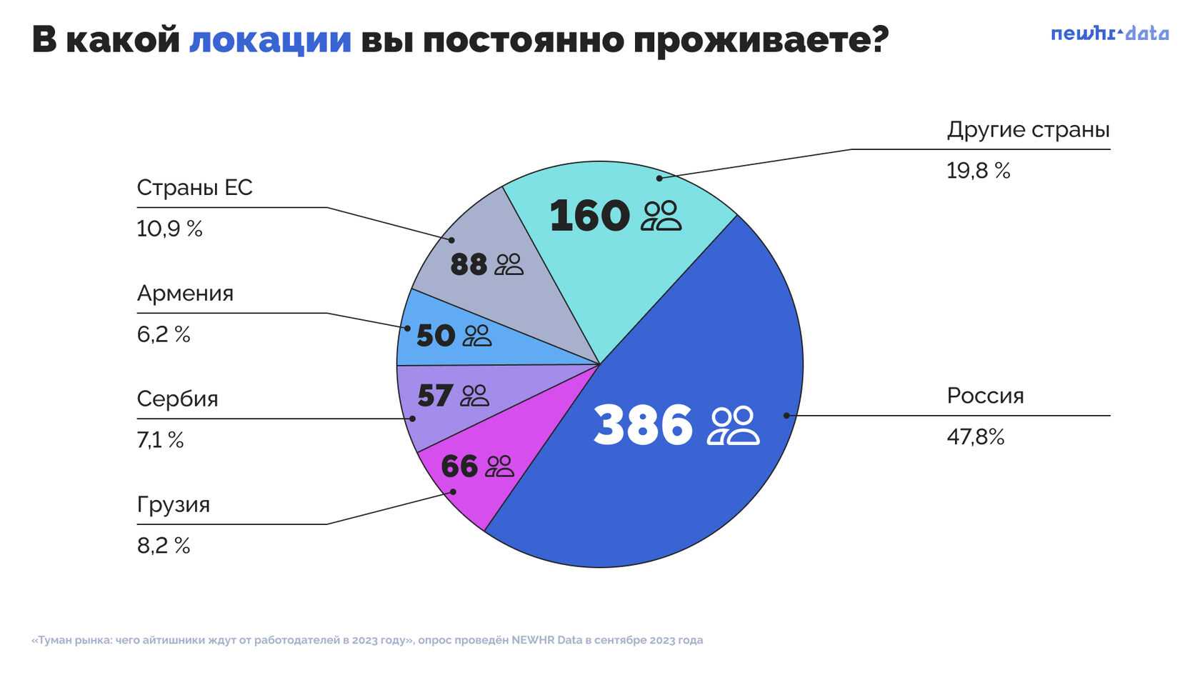 Половина нашей выборки (48%) живёт в России. Каждый десятый — в стране Евросоюза. Топ-10 стран, кроме РФ, где постоянно живут русскоязычные айтишники: Грузия, Сербия, Армения, Кипр, Черногория, Турция, Казахстан, Беларусь, Германия и Узбекистан.География наших респондентов охватывает 49 стран: от Китая и Филиппин до США и Бразилии.