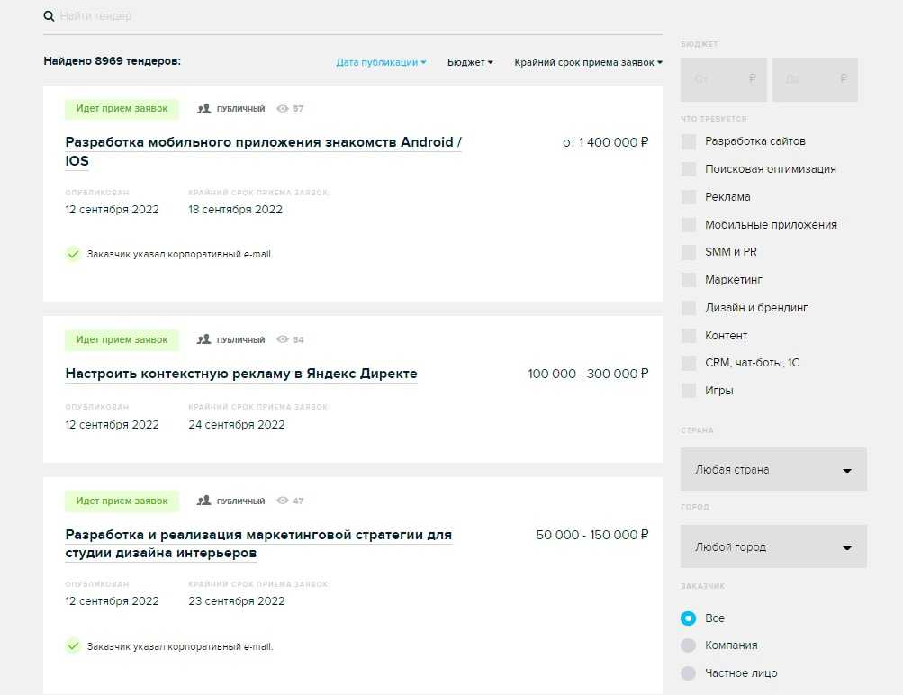 Пожалуй, оптимальный способ найти подрядчика. Такие сервисы привлекают заказчиков и исполнителей и помогают им найти друг друга. Бизнес публикует свои тендеры, агентства на них откликаются.