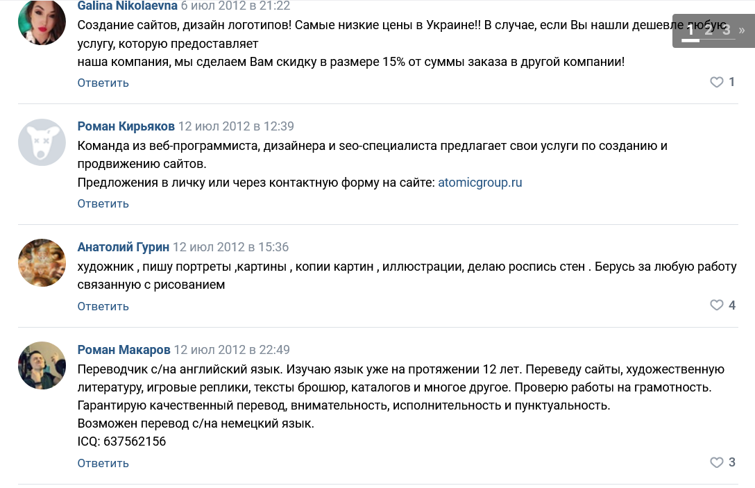 В профильных сообществах сидят все: фрилансеры, представители агентств, бирж, специализированных сервисов. А вместе с ними и мошенники, которые только и ждут, чтобы взять предоплату и удалить страницу. В общем, неплохой способ найти кота в мешке или нормального подрядчика — кому как повезет.