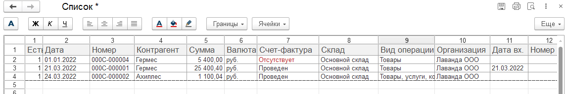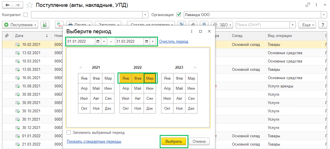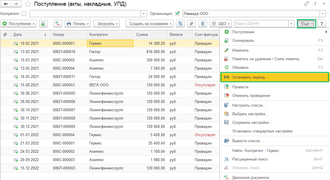 Для упрощения проверки можно сформировать реестр документов и проверить реквизиты в нем. Для этого пройдите в журнал документов нужного вида, делаете отбор по периоду через Еще – Установить период