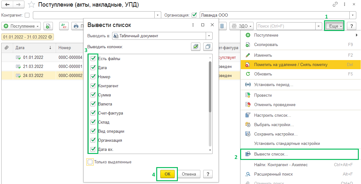 Для выведения списка нажмите Еще – Вывести список и в открывшемся окне оставьте галки на тех реквизитах, которые будут нужны для проверки