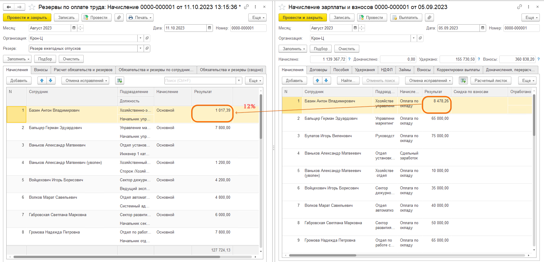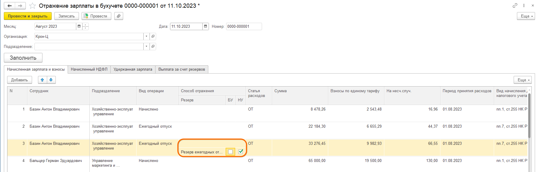 В конце месяца при формировании документа Отражение зарплаты в бухучете (Зарплата – Отражение зарплаты в бухучете) анализируется, какие виды начислений были задействованы в текущем месяце и проверяется наличие настроек резервов для таких начислений.