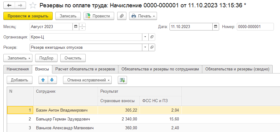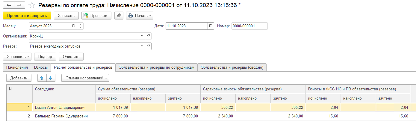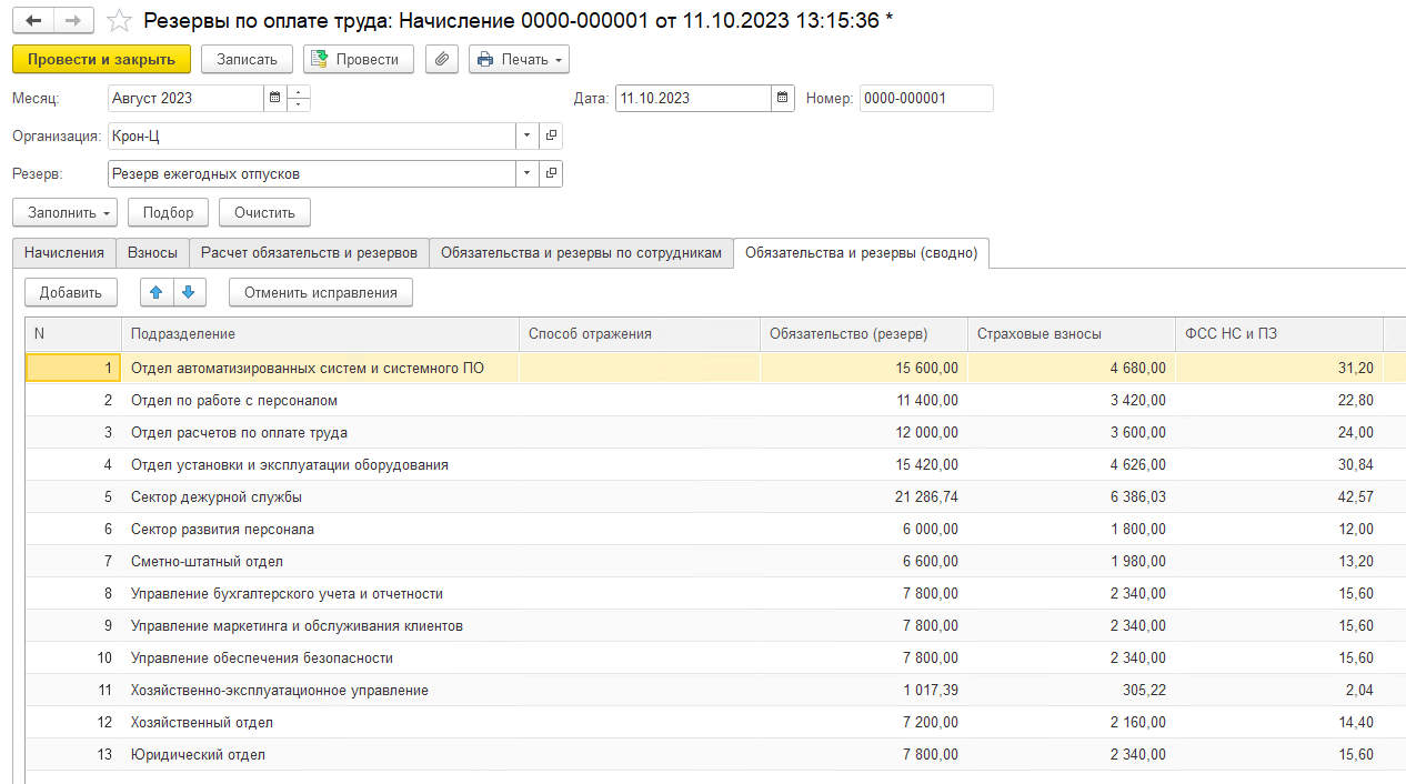 Обязательства и резервы (сводно) — сводные суммы для отражения в учете. Эти данные предназначены для передачи в бухгалтерскую программу для отражения на счетах учета резервов (для формирования проводок).