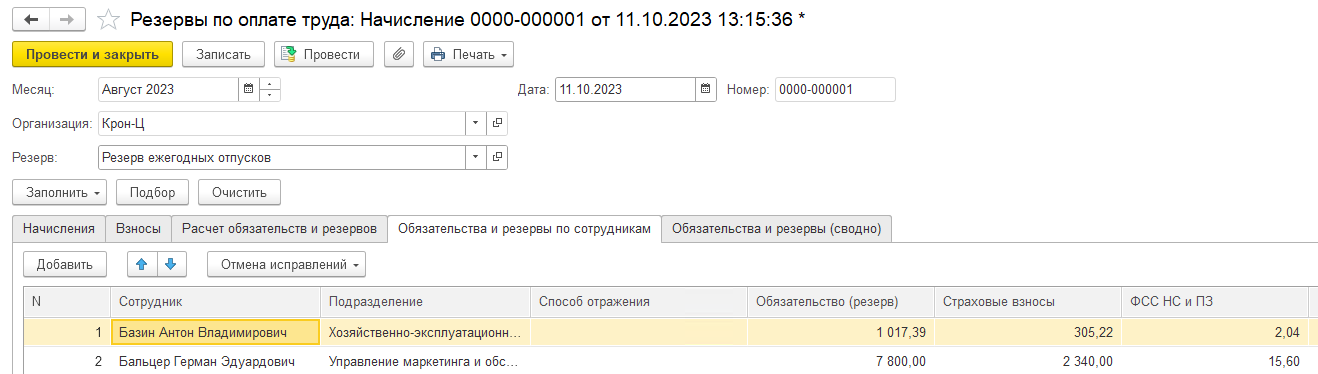 · Обязательства и резервы по сотрудникам — итоговые суммы для отражения в подсистеме учета резервов в разрезе сотрудников, подразделений и способов отражения. Эти данные могут использоваться для контроля итоговых сумм