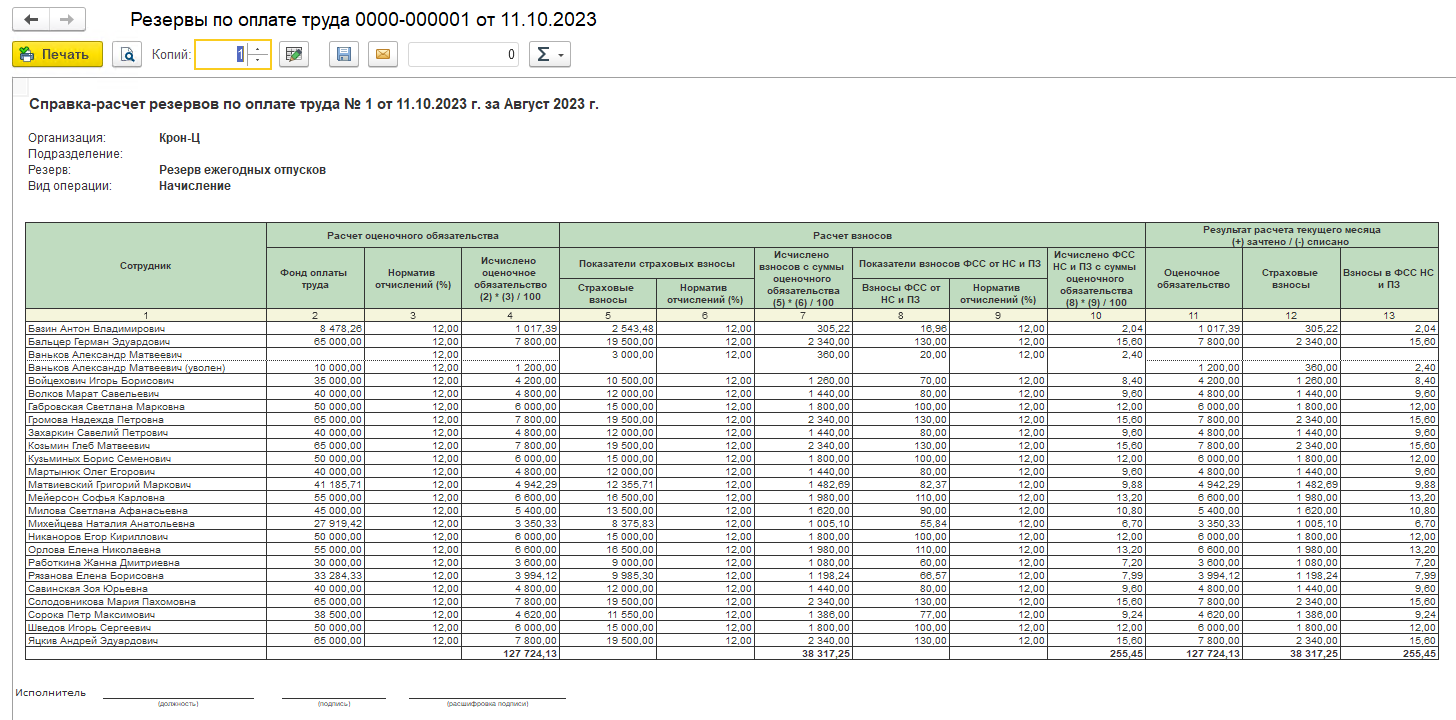 По кнопке Печать (в шапке документа) можно распечатать справку-расчет резервов по оплате труда (в справке можно увидеть подробный расчет ОО по сотрудникам).