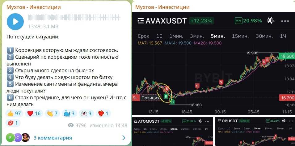Ильнур Мухтов в текстовом и голосовом формате представляет свои точки входа и выхода из позиций и делится мнением о состоянии криптовалютой индустрии в целом.