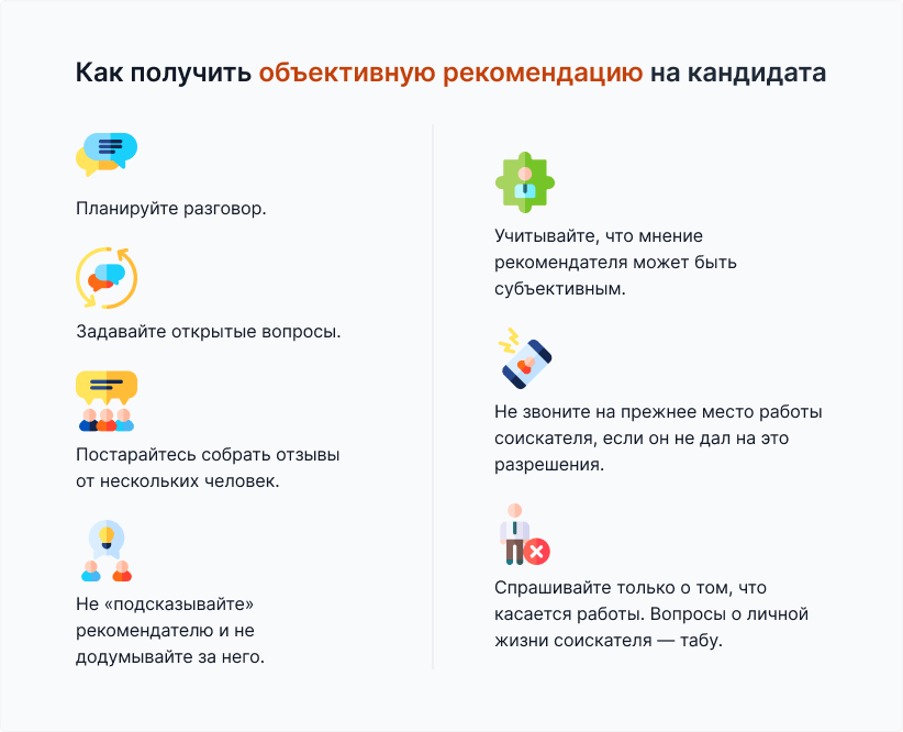 Претендент вправе отказаться от предоставления номеров телефонов бывших коллег, но тогда постарайтесь выяснить причину такого поведения. Возможно, человек еще не уволился и не хочет распространяться о планах по переходу в другую организацию. В остальных случаях отказ должен насторожить вас — вероятно, соискателю есть что скрывать.