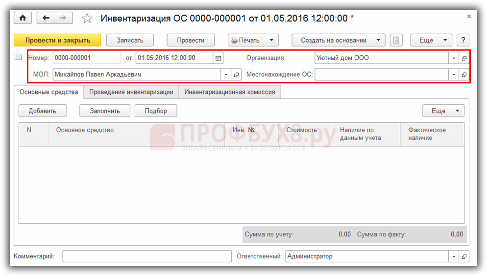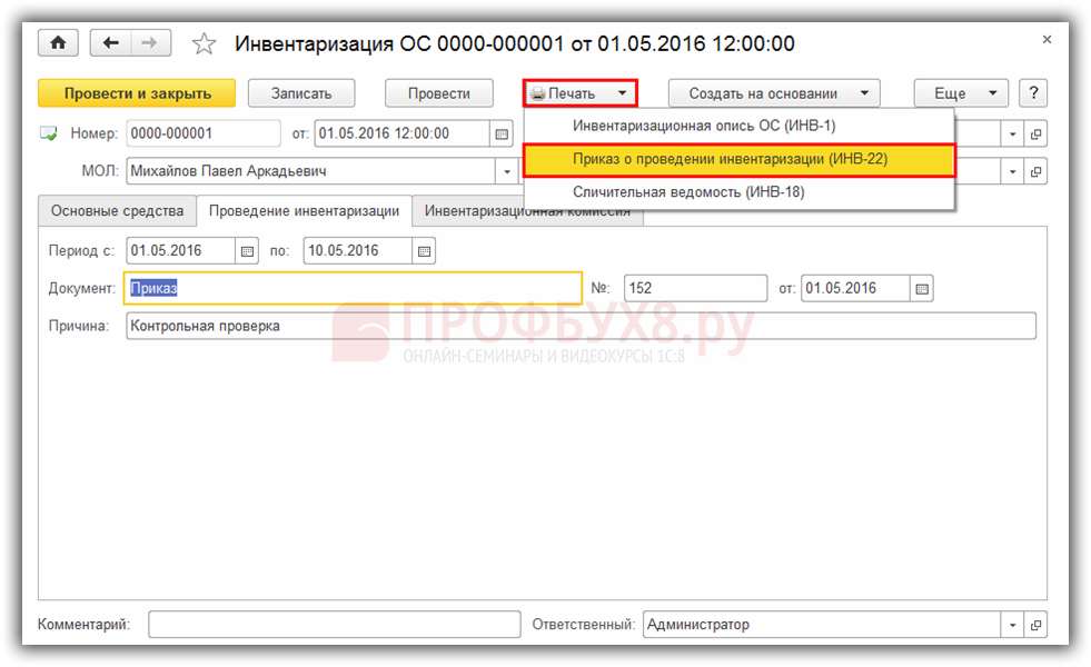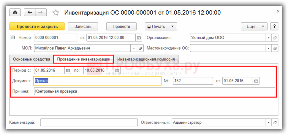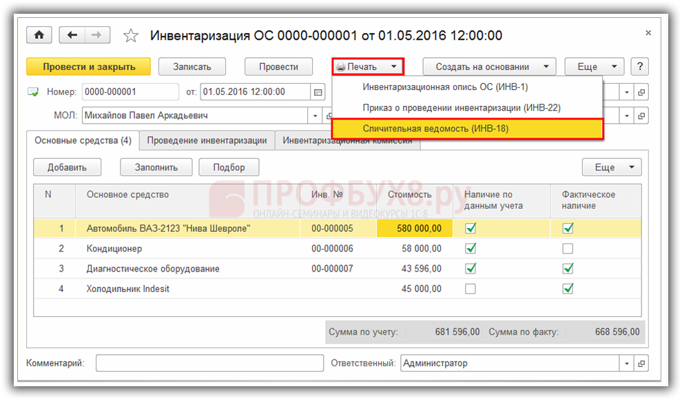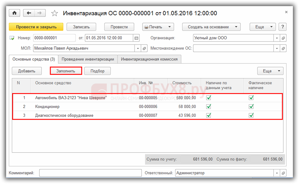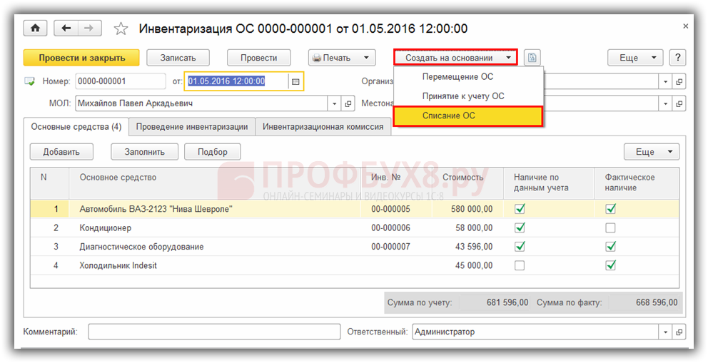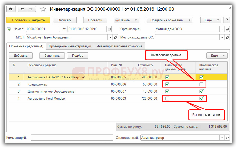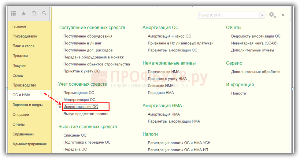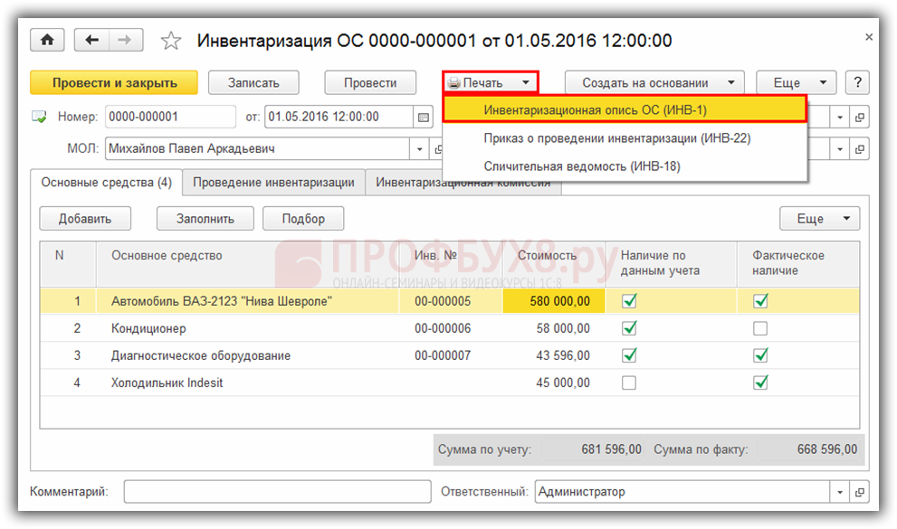 Порядок проведения инвентаризации основных средств и учет ее результатов в 1С 8.3