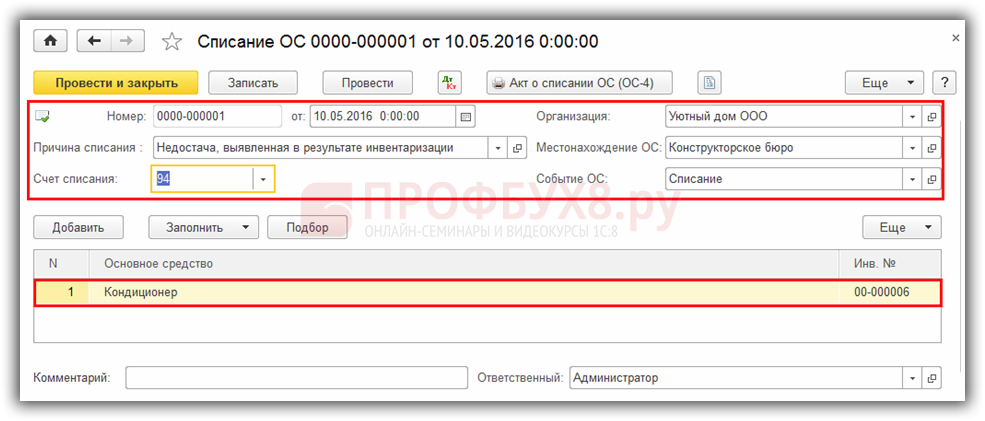 1С Бухгалтерия 8.3 позволяет не только оформить документы для проведения инвентаризации ОС, но и по ее результатам списать недостачу либо оприходовать выявленные излишки.