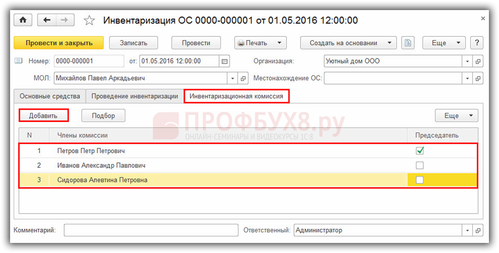 На закладке Инвентаризационная комиссия, используя кнопку Добавить, выбираем членов комиссии из справочника Физические лица. Флажком отмечается сотрудник, который будет назначен в качестве председателя инвентаризационной комиссии: