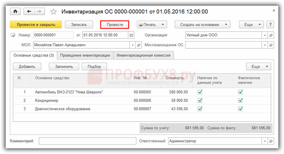 Документ Инвентаризация ОС в 1С 8.3 не создает движений по регистрам учета. Документ можно записать и провести по одноименной кнопке: