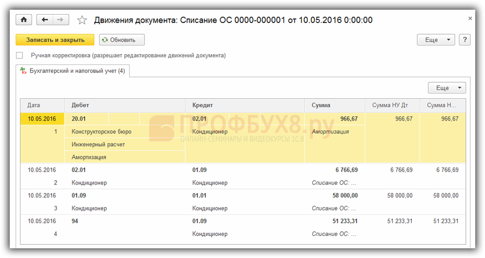 - Дт 01В Кт 01 — Списание первоначальной стоимости;