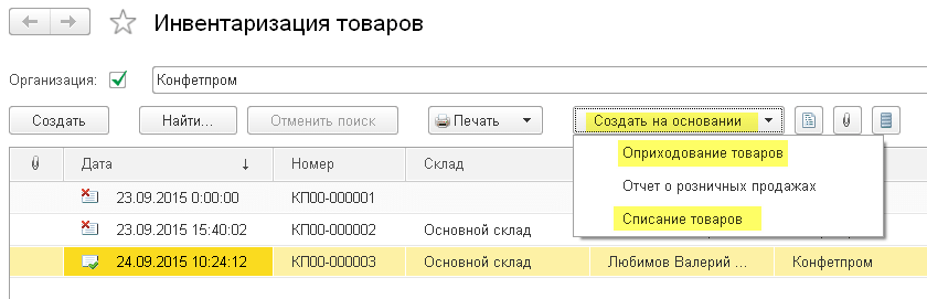 Теперь наша задача списать в учёте выявленную недостачу и оприходовать излишки.