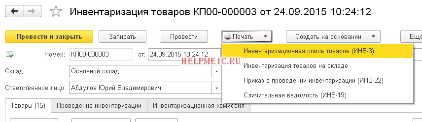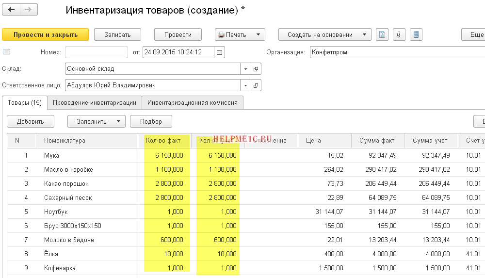 Изначально председатель комиссии заполняет документ, где будет указано количество материальных ценностей по данным учетной программы.