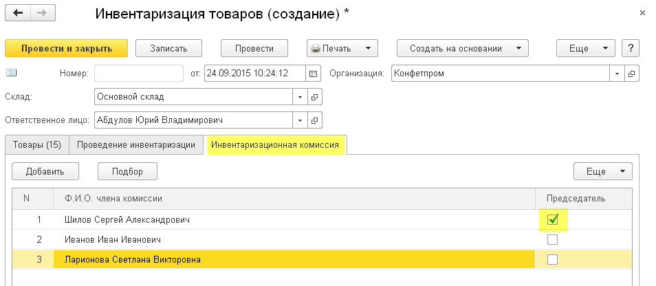 На вкладке Инвентаризационная комиссия по кнопке Добавить из справочника Физические лица заполняется состав инвентаризационной комиссии. В графе Председатель с помощью флажка отмечается сотрудник, который назначен председателем инвентаризационной комиссии.