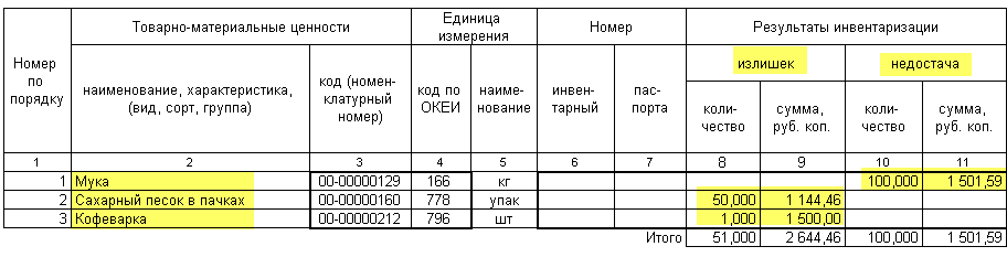 По умолчанию колонка «Количество факт» равна колонке «Количество учет». Их равенство означает отсутствие отклонений, но в нашем случае выявлены фактические недостачи муки (100 кг) и излишки сахара (50 кг) и кофеварки (1 шт).
