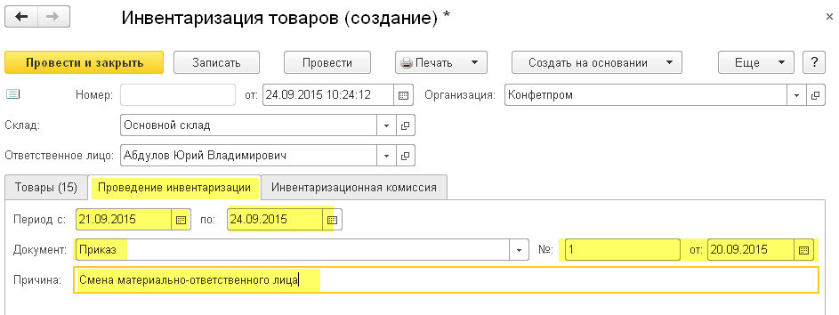 Переходим на закладку «Проведение инвентаризации» и указываем здесь период проведения, причину и документ, утвердивший инвентаризацию: