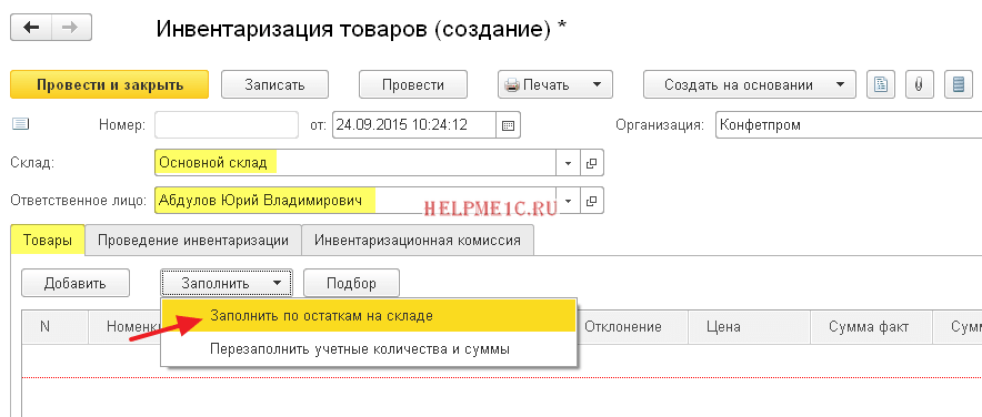 Поле Склад заполняется из справочника Склады. Поле Ответственное лицо будет заполнено автоматически при условии, что в карточке склада было указано Ответственное лицо.