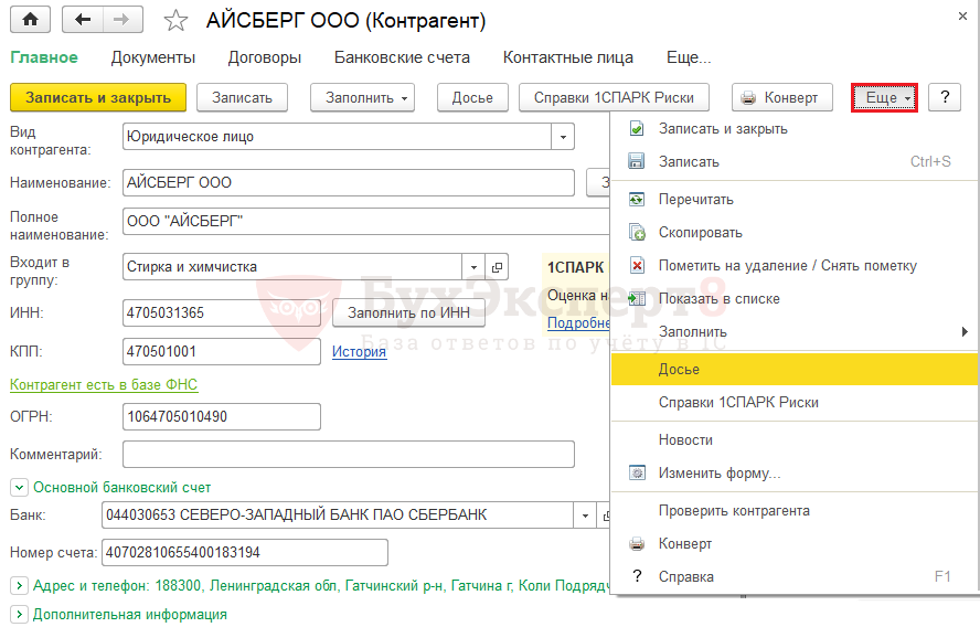 Для введенных в базу контрагентов досье выводится прямо из карточки контрагента по кнопке ЕЩЕ — Досье.