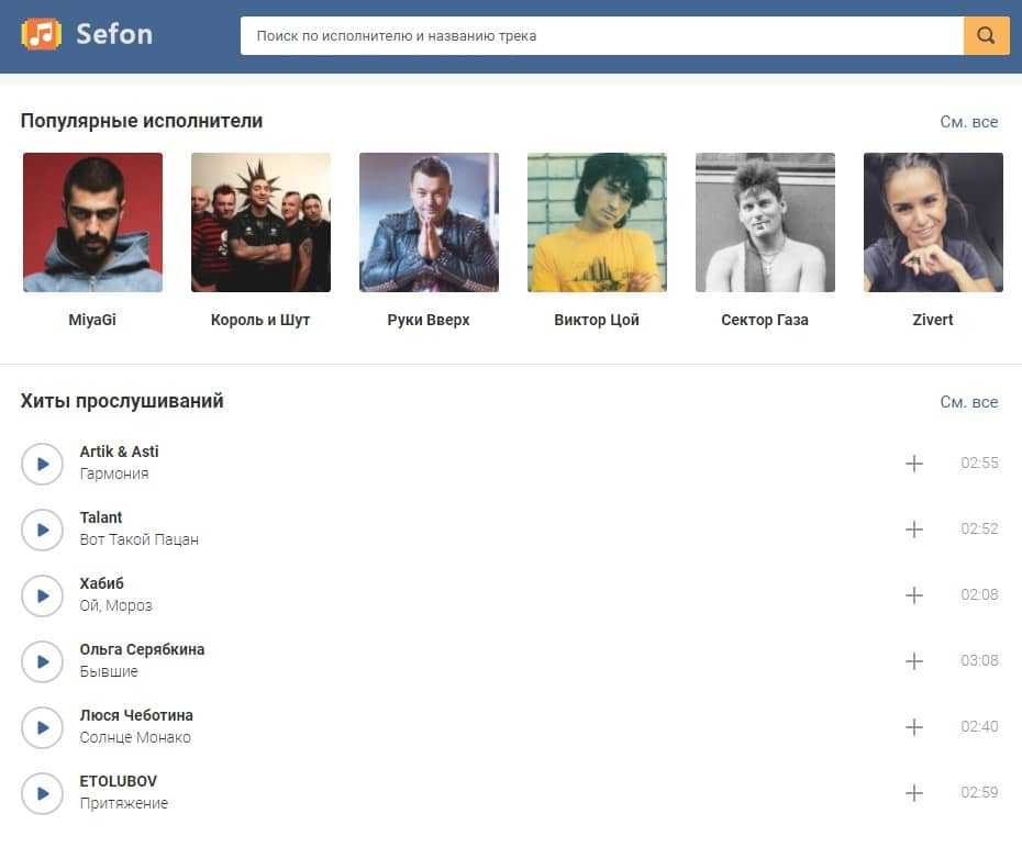 Sefon.pro – проверенный веб-ресурс, где множество хорошей музыки различных композиторов. Есть множество произведений зарубежных групп и исполнителей, многие из которых доступны для скачивания в один клик. Однако есть и треки, у которых правообладатели ограничили скачивание. В плане количества музыки и удобства использования, это один из лучших сайтов.