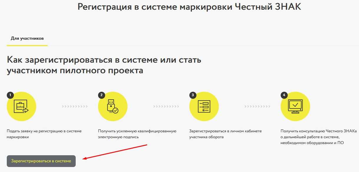 Регистрация начинается на официальном сайте Честного знака, там нужно найти активную кнопку «Зарегистрироваться в системе»: