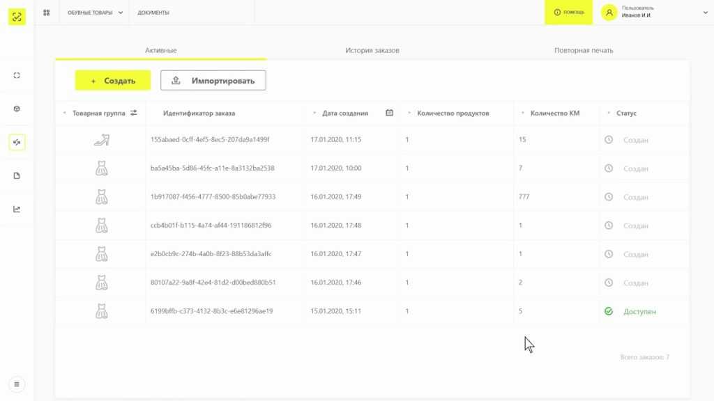 - Заказать коды в “Честном ЗНАКе”. В разделе “Товарные группы” откроется доступ к заказу КиЗ. Пополните баланс и перейдите на “Станцию управления заказами”. Заполните заявку и дожидайтесь выпуска кодов маркировки;