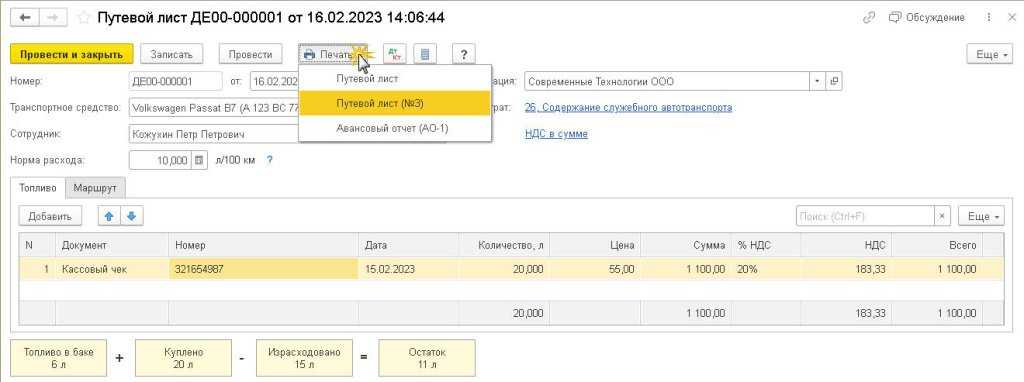После включения указанной настройки в программе появляется новый документ – Путевой лист.