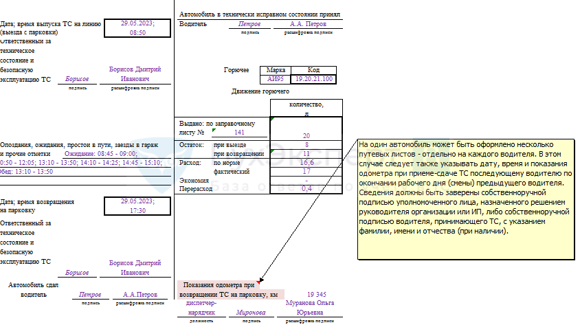 Новыми правилами уточнен порядок внесения показаний одометра для случаев, когда на авто работает не один водитель. В нашем примере он один, а что делать в ситуации с несколькими —представлено в примечании на схеме: