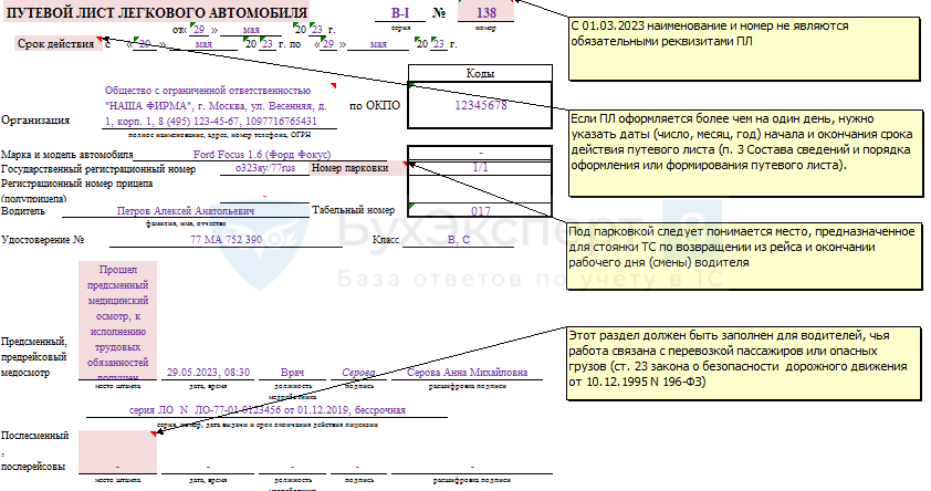 У транспортного средства один водитель, и ПЛ выписан в одном экземпляре. Возможные вариации и указания на изменения в путевых листах с 01.03.2023 приведены в примечаниях к путевому листу: